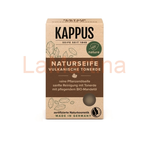 Kappus Natural Soap Volcanic Clay je mýdlo z čistých rostlinných olejů. Díky obsahu sopečného jílu je obzvláště vhodné pro namáhanou pokožku. Vysoký obsah glycerinu navíc dodává pokožce dostatečnou hydrataci. Mýdlo je vyrobeno na bázi čistých rostlinných olejů, a proto je 100% veganské.